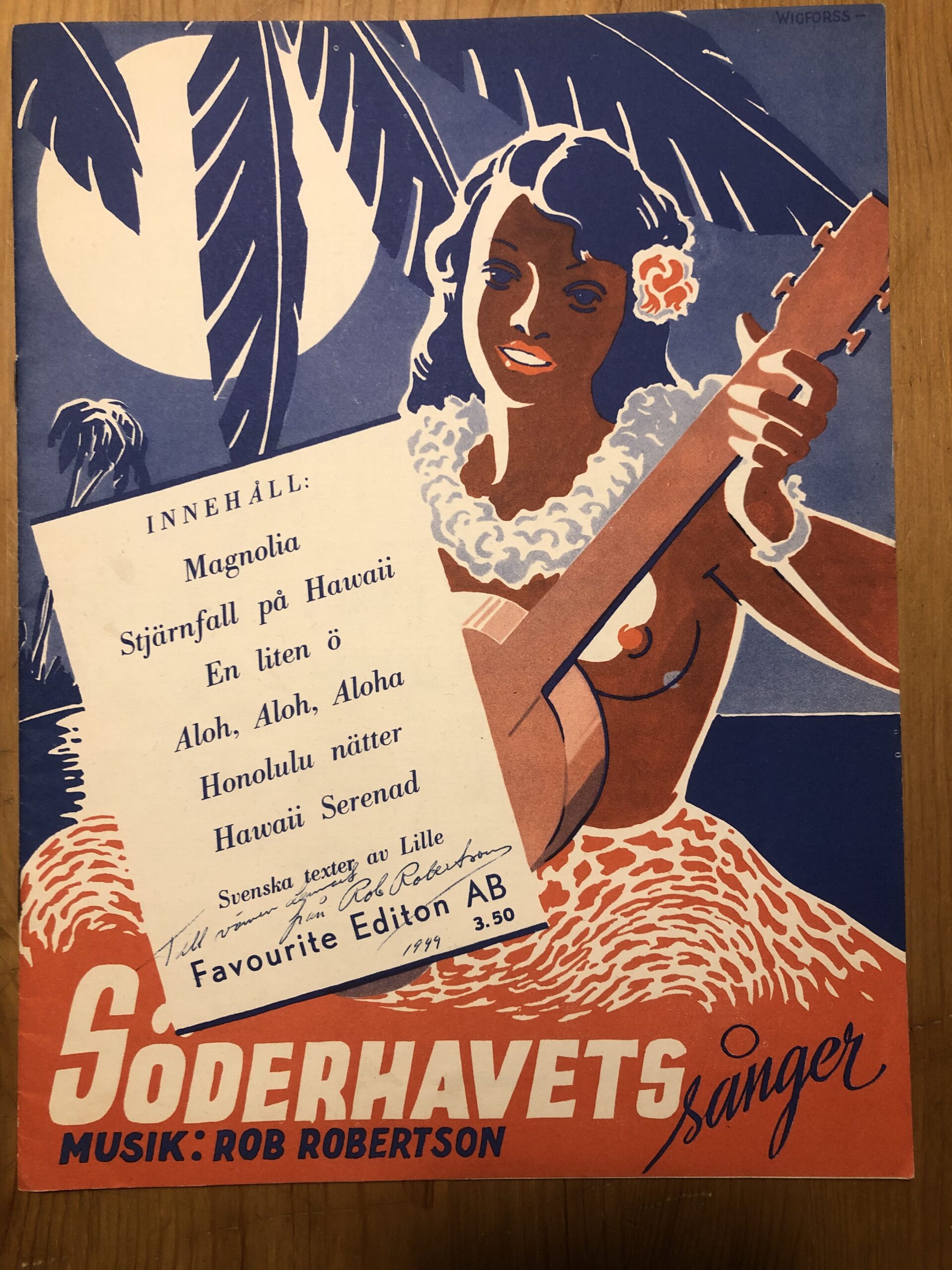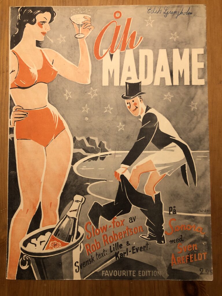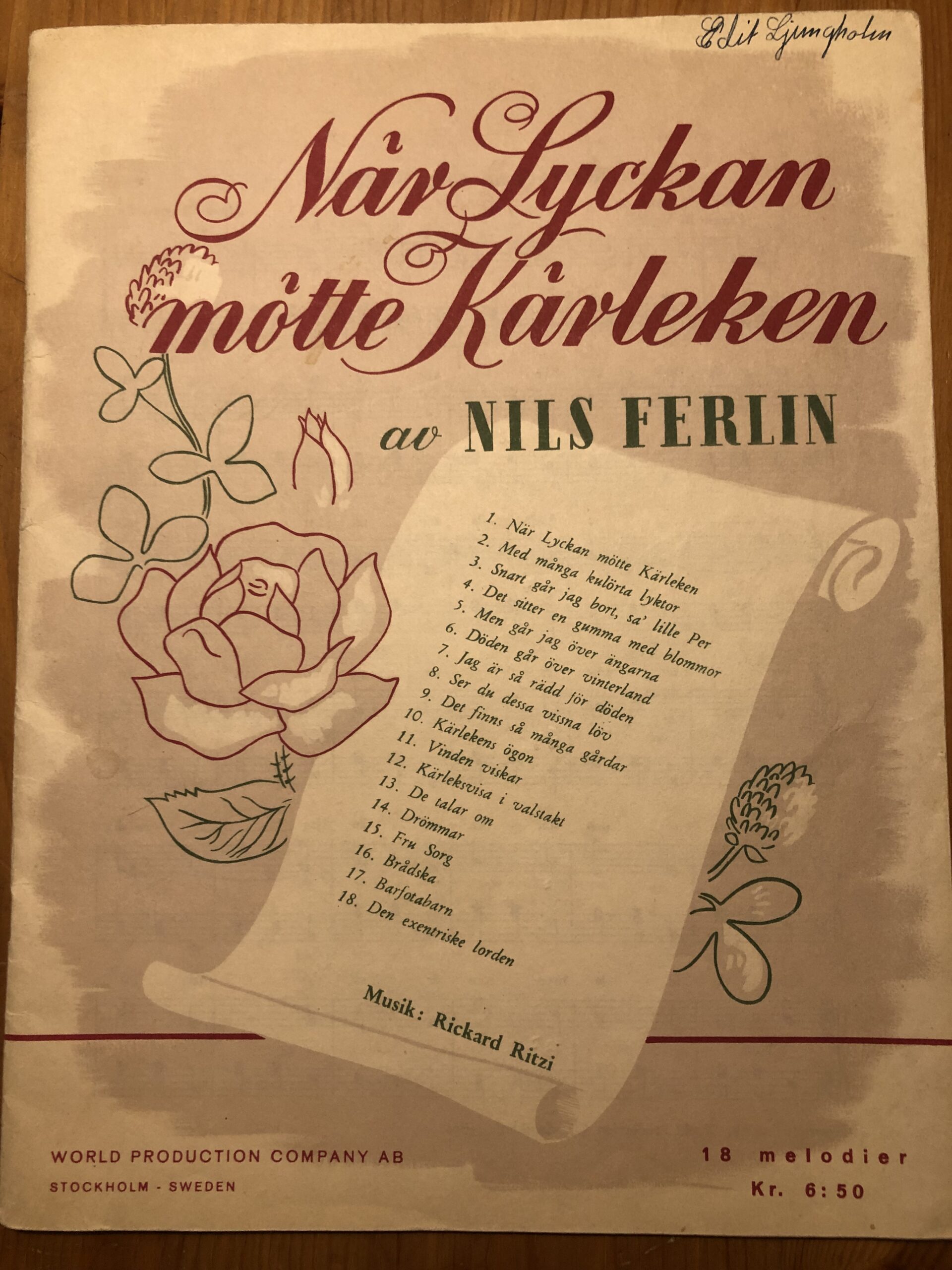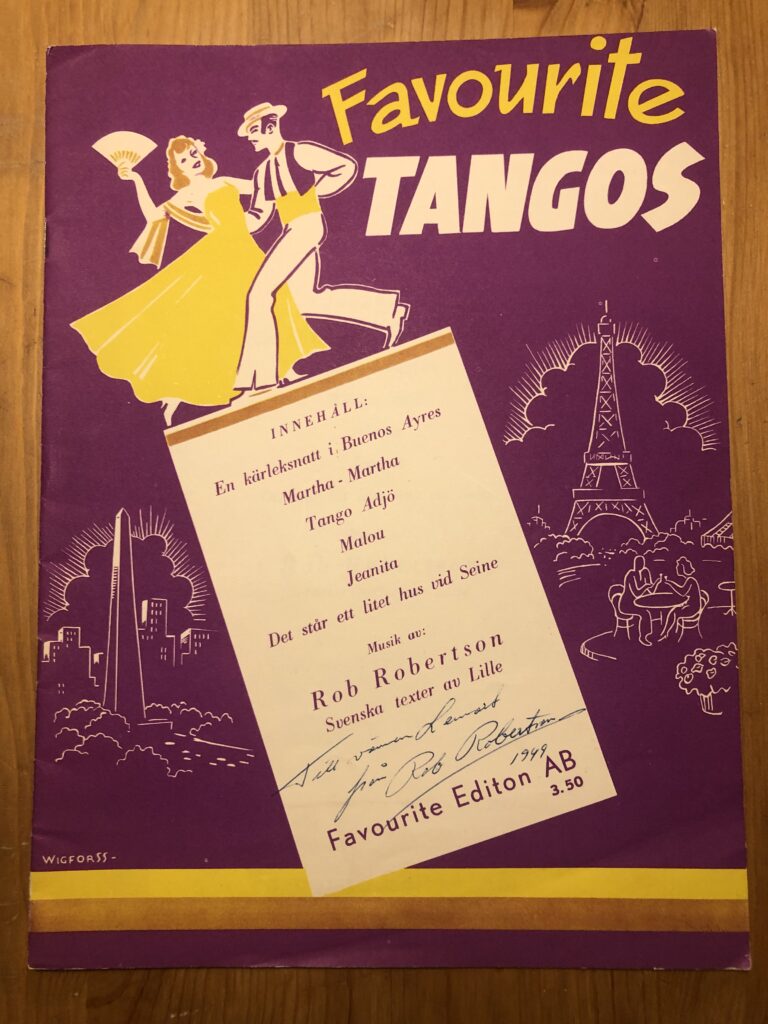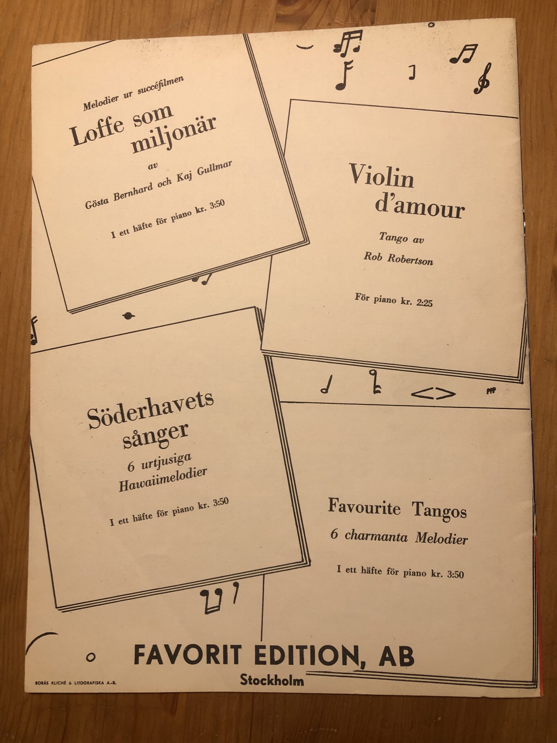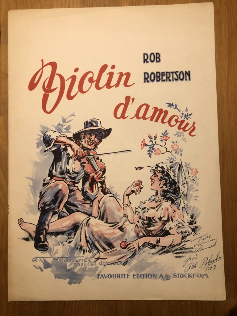 En dag kom det ett meddelande till sällskapet. Ingrid Ljungholm undrade om vi ville ha en samling signerade notblad med kompositioner av Rob Robertsson, Rickard Ritzi och Juan Delgada, samtliga pseudonymer för Johnny Bode. Det var noter som Johnny givit till sin vän Lennart Ljungholm, Ingrids pappa. Ett av notbladen: ”Med flyg till sjunde himlen” var dessutom resultatet av ett samarbete mellan Johnny och Lennart.